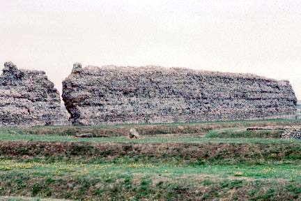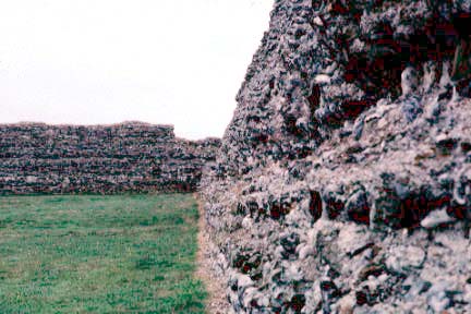 Richborough is believed to be the landing point of the Roman invasion armies in 43 AD. The foundations of a quadrifrons triumphal arch thought to commemorate this are in the middle of the earthworks shown in first photo. The earthworks themselves were added in the third century when the arch became a coastal signal tower watching for pirates. The huge stone walls were added in the late third century when the site became what is known as a Saxon Shore Fort, guarding the coast against marauders. After the fall of the Roman Empire, an early Christian site was established within the abandoned fort walls.